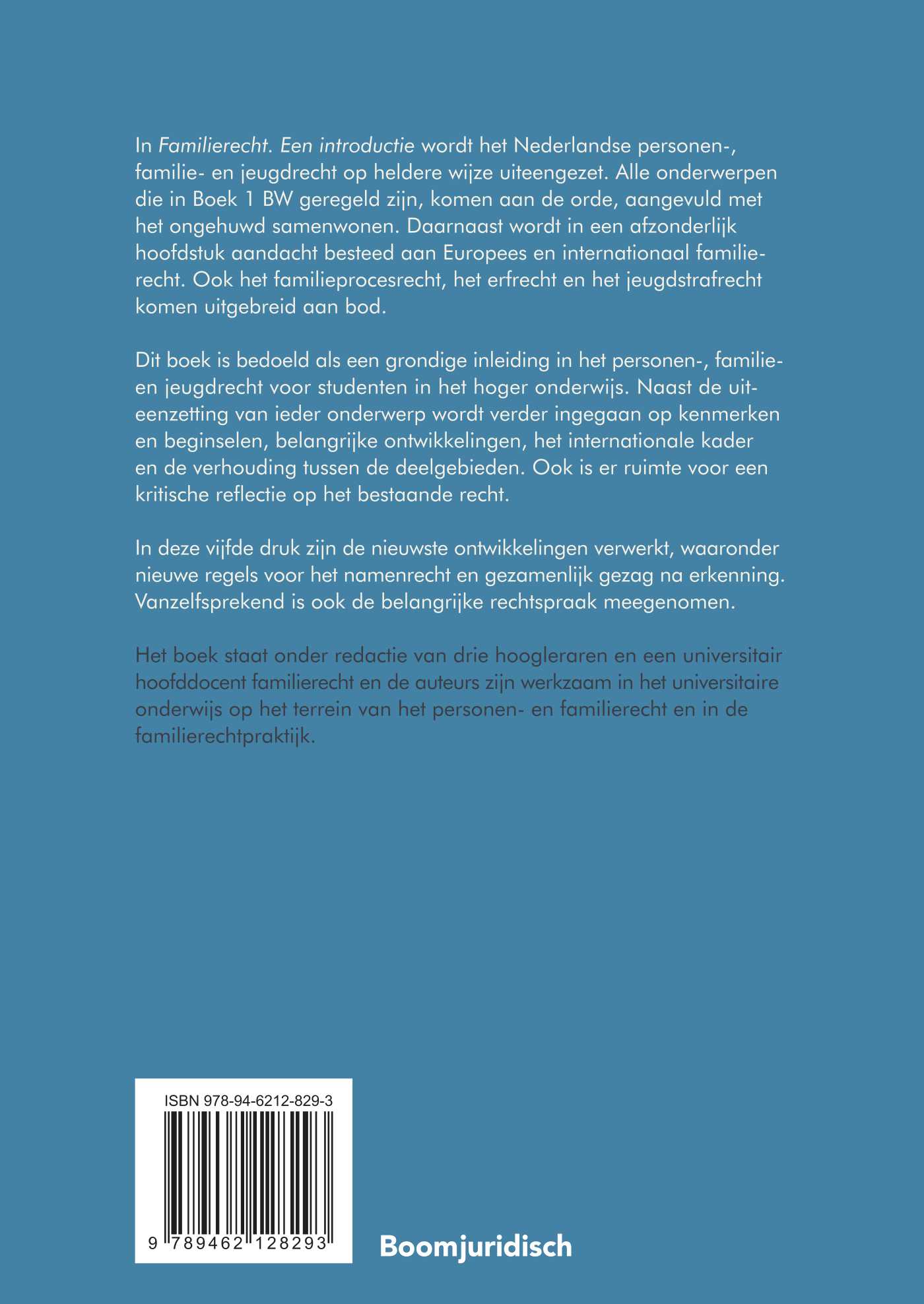 In Familierecht. Een introductie wordt het Nederlandse personen-, familie- en jeugdrecht op heldere wijze uiteengezet. Alle onderwerpen die in Boek 1 BW geregeld zijn, komen aan de orde, aangevuld met het ongehuwd samenwonen. Daarnaast wordt in een afzonderlijk hoofdstuk aandacht besteed aan Europees en internationaal familierecht. Ook het familieprocesrecht, het erfrecht en het jeugdstrafrecht komen uitgebreid aan bod.