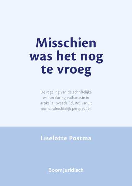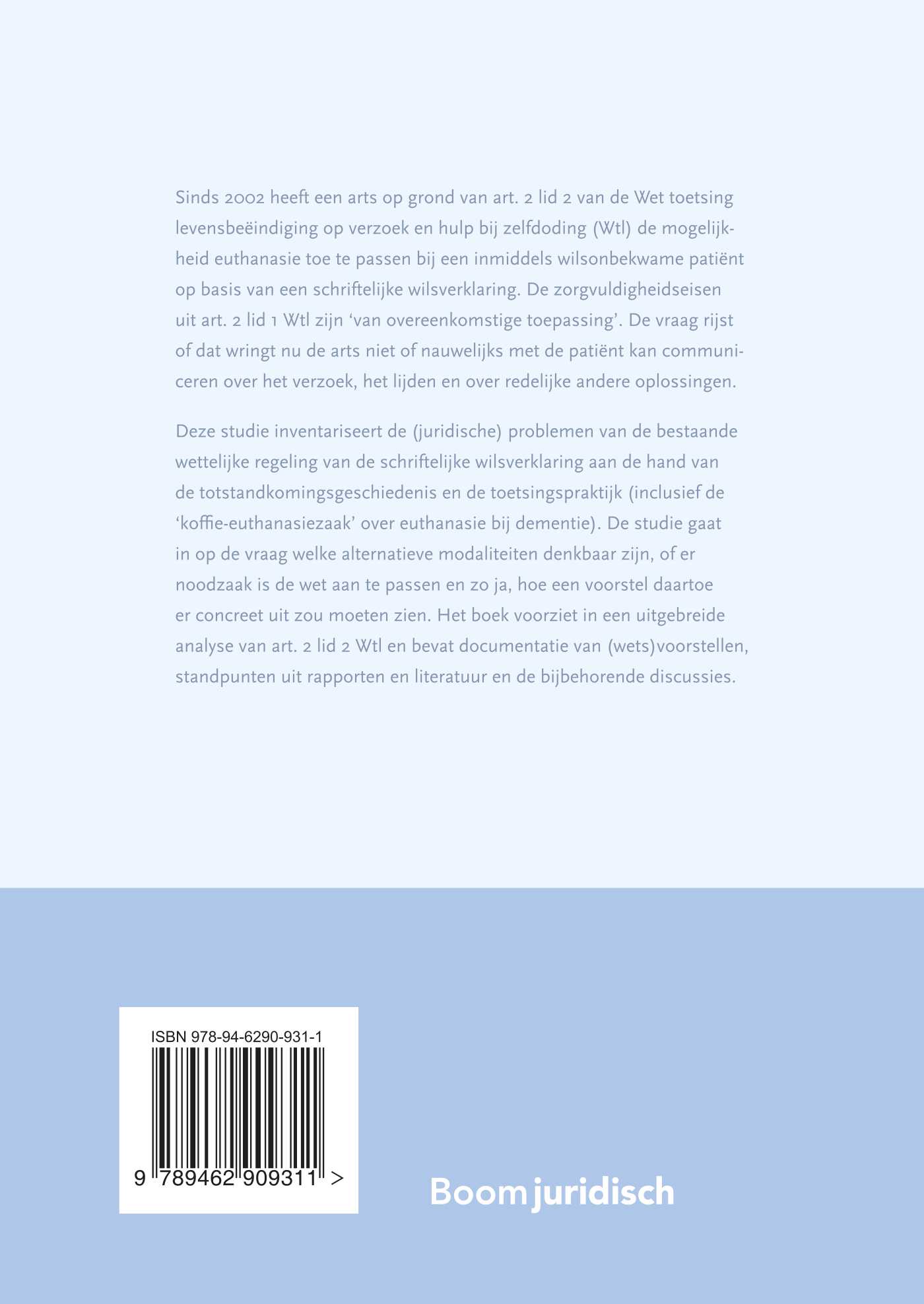 Deze studie inventariseert de (juridische) problemen van de bestaande wettelijke regeling van de schriftelijke wilsverklaring aan de hand van de totstandkomingsgeschiedenis en de toetsingspraktijk (inclusief de ‘koffie­euthanasiezaak’ over euthanasie bij dementie). De studie gaat in op de vraag welke alternatieve modaliteiten denkbaar zijn, of er noodzaak is de wet aan te passen en zo ja, hoe een voorstel daartoe er concreet uit zou moeten zien. Het boek voorziet in een uitgebreide analyse van art. 2 lid 2 Wtl en bevat documentatie van (wets)voorstellen, standpunten uit rapporten en literatuur en de bijbehorende discussies.