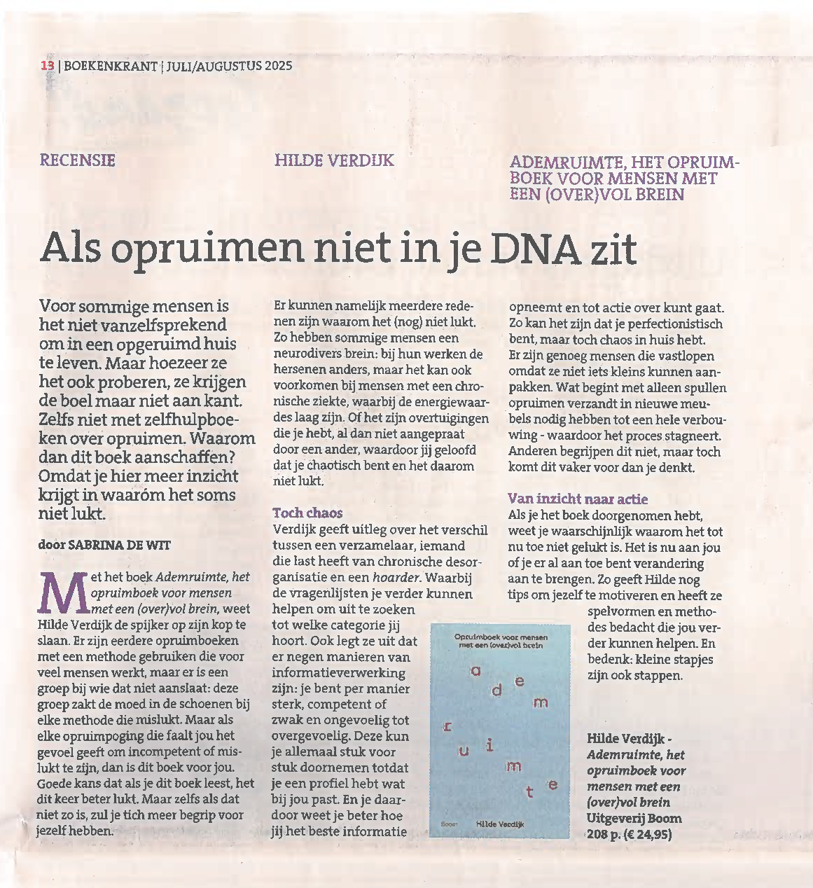 'Als opruimen niet in je DNA zit. Met het boek Ademruimte, het opruimboek voor mensen met een (over)vol brein, weet Hilde Verdijk de spijker op zijn kop te slaan. Er zijn eerdere opruimboeken met een methode gebruiken die voor veel mensen werkt, maar er is een groep bij wie dat niet aanslaat (...) Goede kans dat als je dit boek leest, het dit keer beter lukt. Maar zelfs als dat niet zo is, zul je tich meer begrip voor jezelf hebben.'