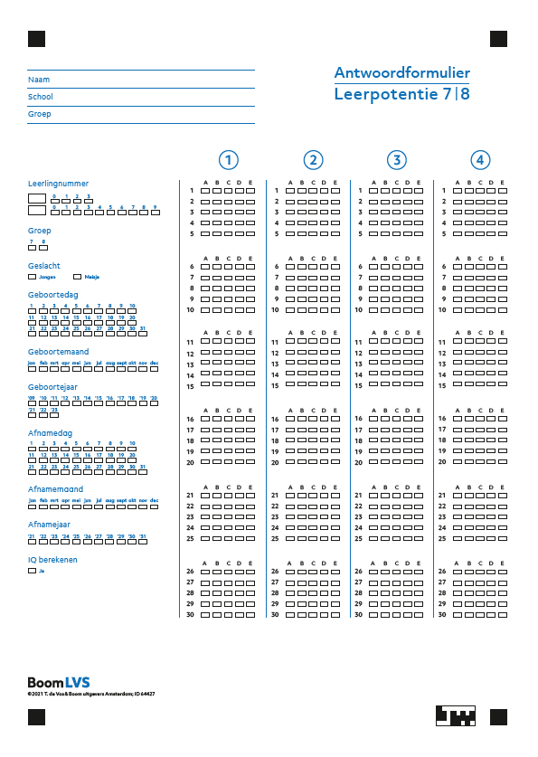 Op het antwoordformulier is ook ruimte voor Leermotivatie 6-7-8. Neem je Leerpotentie 7-8 en Leermotivatie 6-7-8 gezamenlijk af? Dan gebruik je het antwoordformulier van Leerpotentie 7-8. Losse antwoordformulieren voor Leermotivatie 6-7-8 zijn dan niet nodig.