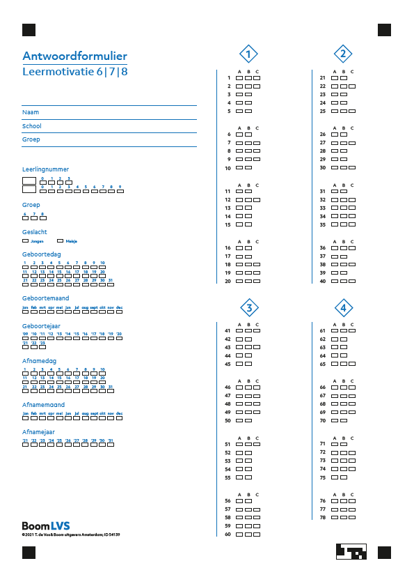 Dit product bevat een set van 25 antwoordformulieren voor deze vragenlijst. Deze formulieren worden door Boom test onderwijs verwerkt en kunnen niet online worden genormeerd. Leermotivatie 6-7-8 kan wel volledig online worden afgenomen in het Boom testcentrum. Hiervoor dien je credits aan te schaffen. Om de vragenlijst af te nemen dien je ook over de basisset van Leermotivatie 6-7-8 te beschikken.