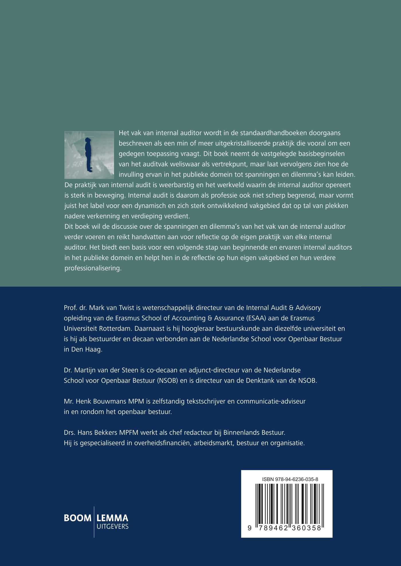 Dit boek wil de discussie over de spanningen en dilemma’s van het vak van de internal auditor verder voeren en reikt handvatten aan voor refl ectie op de eigen praktijk van elke internal auditor. Het biedt een basis voor een volgende stap van beginnende en ervaren internal auditors in het publieke domein en helpt hen in de reflectie op hun eigen vakgebied en hun verdere professionalisering.