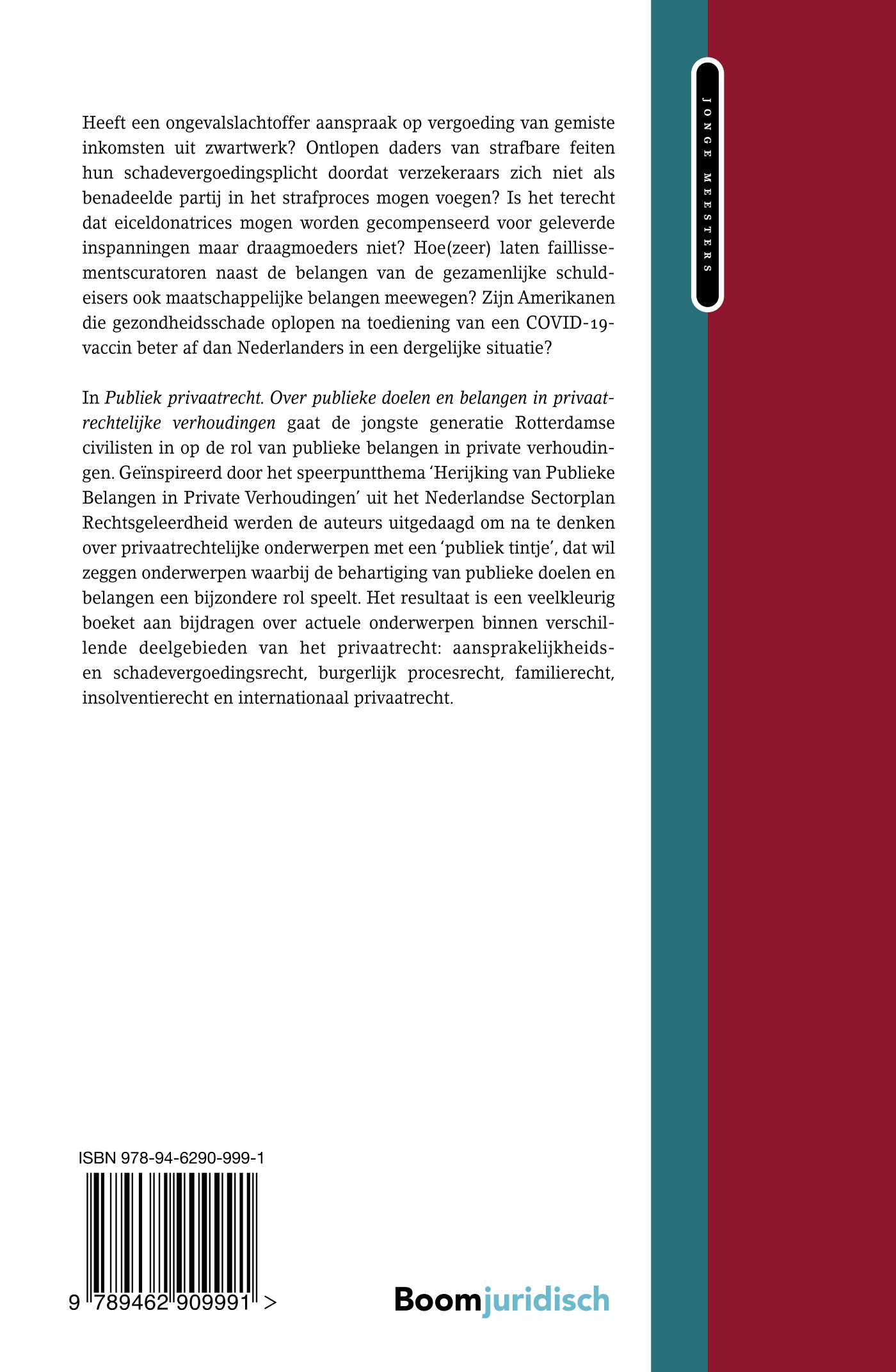 In Publiek privaatrecht. Over publieke doelen en belangen in privaatrechtelijke verhoudingen gaat de jongste generatie Rotterdamse civilisten in op de rol van publieke belangen in private verhoudingen. Geïnspireerd door het speerpuntthema ‘Herijking van Publieke Belangen in Private Verhoudingen’ uit het Nederlandse Sectorplan Rechtsgeleerdheid werden de auteurs uitgedaagd om na te denken over privaatrechtelijke onderwerpen met een ‘publiek tintje’, dat wil zeggen onderwerpen waarbij de behartiging van publieke doelen en belangen een bijzondere rol speelt. Het resultaat is een veelkleurig boeket aan bijdragen over actuele onderwerpen binnen verschillende deelgebieden van het privaatrecht: aansprakelijkheids- en schadevergoedingsrecht, burgerlijk procesrecht, familierecht, insolventierecht en internationaal privaatrecht.