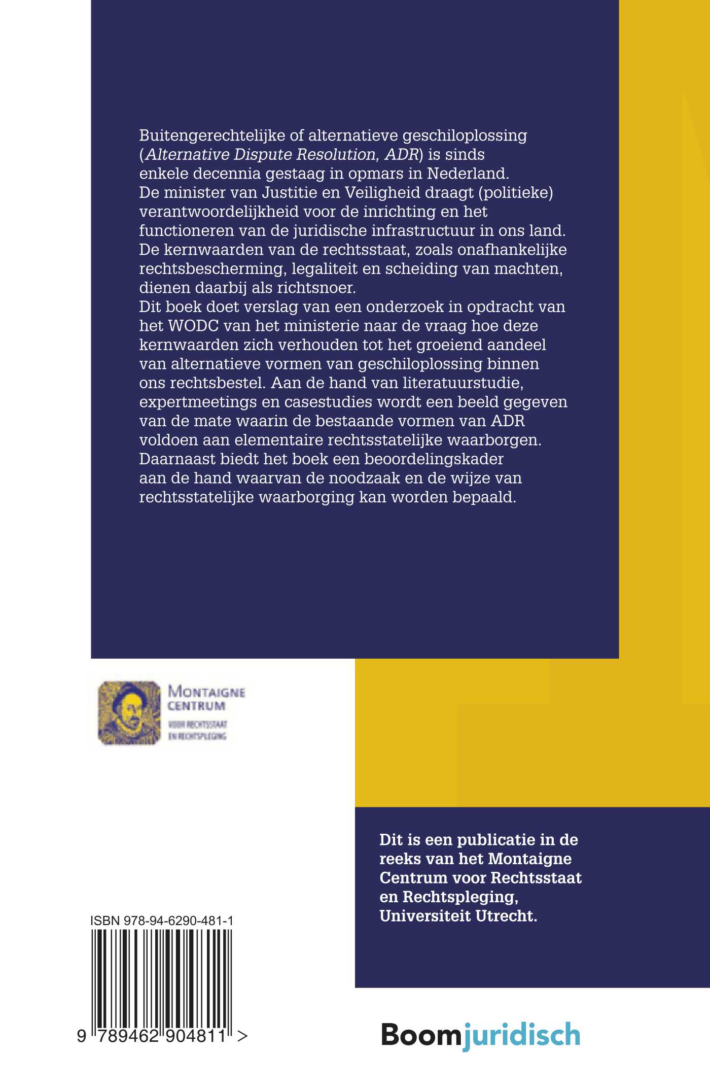 Dit boek doet verslag van een onderzoek in opdracht van het WODC van het ministerie naar de vraag hoe deze kernwaarden zich verhouden tot het groeiend aandeel van alternatieve vormen van geschiloplossing binnen ons rechtsbestel. Aan de hand van literatuurstudie, expertmeetings en casestudies wordt een beeld gegeven van de mate waarin de bestaande vormen van ADR voldoen aan elementaire rechtsstatelijke waarborgen. Daarnaast biedt het boek een beoordelingskader aan de hand waarvan de noodzaak en de wijze van rechtsstatelijke waarborging kan worden bepaald.