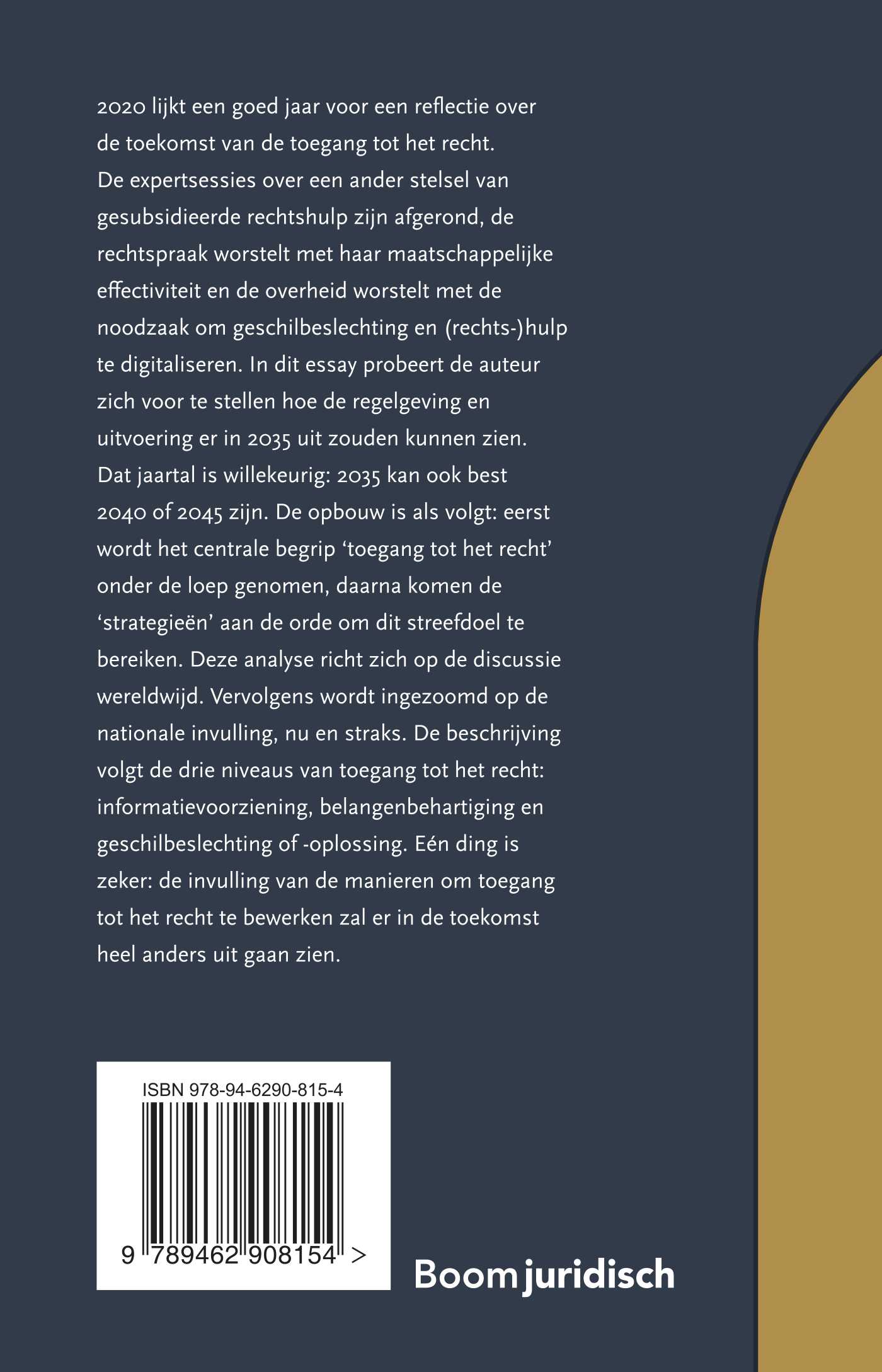 2020 lijkt een goed jaar voor een reflectie over de toekomst van de toegang tot het recht. De expertsessies over een ander stelsel van gesubsidieerde rechtshulp zijn afgerond, de rechtspraak worstelt met haar maatschappelijke effectiviteit en de overheid worstelt met de noodzaak om geschilbeslechting en (rechts‑)hulp te digitaliseren. In dit essay probeert de auteur zich voor te stellen hoe de regelgeving en uitvoering er in 2035 uit zouden kunnen zien. Dat jaartal is willekeurig: 2035 kan ook best 2040 of 2045 zijn. De opbouw is als volgt: eerst wordt het centrale begrip ‘toegang tot het recht’ onder de loep genomen, daarna komen de ‘strategieën’ aan de orde om dit streefdoel te bereiken. Deze analyse richt zich op de discussie wereldwijd. Vervolgens wordt ingezoomd op de nationale invulling, nu en straks. De beschrijving volgt de drie niveaus van toegang tot het recht: informatievoorziening, belangenbehartiging en geschilbeslechting of ‑oplossing. Eén ding is zeker: de invulling van de manieren om toegang tot het recht te bewerken zal er in de toekomst heel anders uit gaan zien.