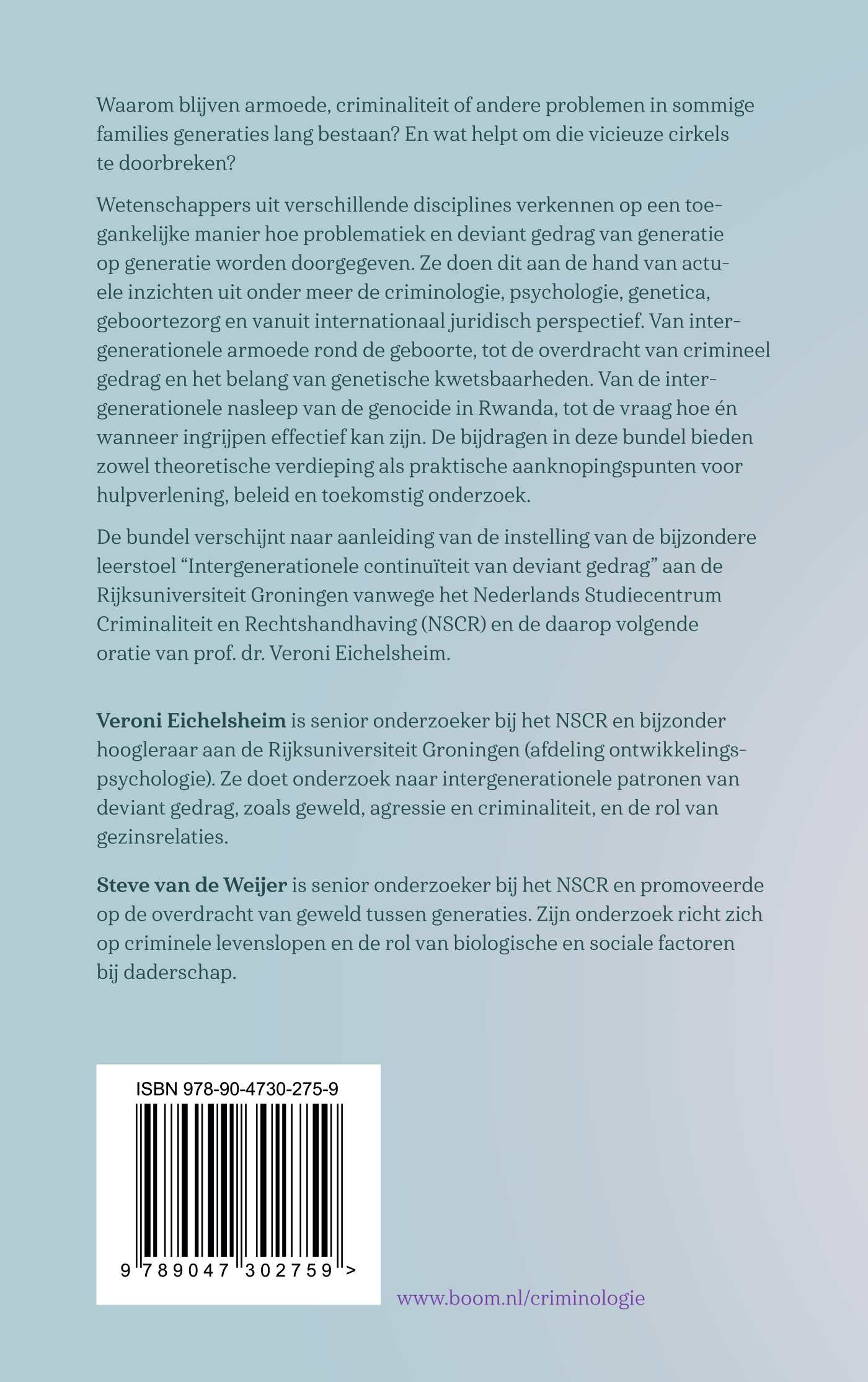 Wetenschappers uit verschillende disciplines verkennen op een toegankelijke manier hoe problematiek en deviant gedrag van generatie op generatie worden doorgegeven. Ze doen dit aan de hand van actuele inzichten uit onder meer de criminologie, psychologie, genetica, geboortezorg en vanuit internationaal juridisch perspectief. Van intergenerationele armoede rond de geboorte, tot de overdracht van crimineel gedrag en het belang van genetische kwetsbaarheden. Van de intergenerationele nasleep van de genocide in Rwanda, tot de vraag hoe én wanneer ingrijpen effectief kan zijn. De bijdragen in deze bundel bieden zowel theoretische verdieping als praktische aanknopingspunten voor hulpverlening, beleid en toekomstig onderzoek.