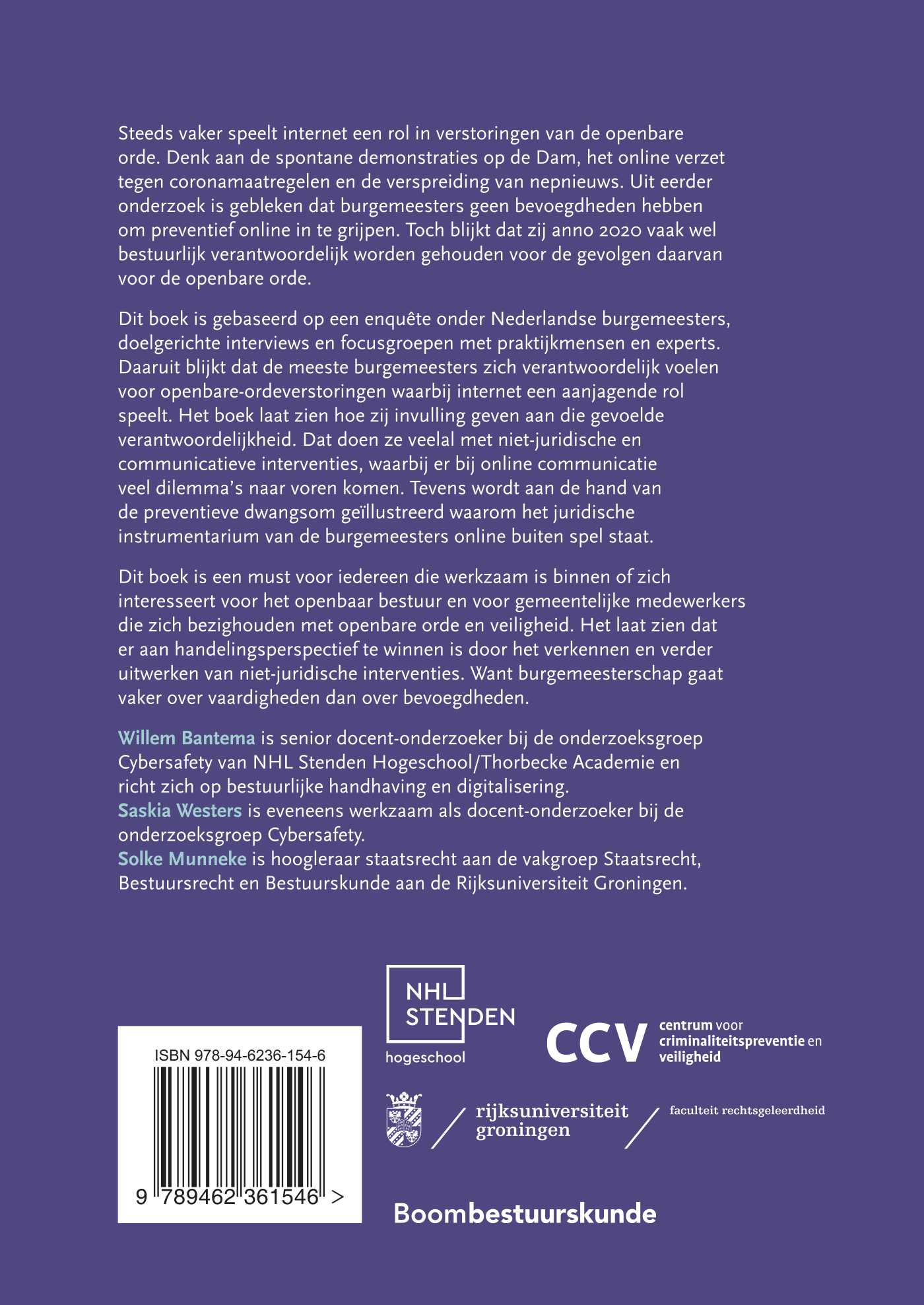 Dit boek is gebaseerd op een enquête onder Nederlandse burgemeesters, doelgerichte interviews en focusgroepen met praktijkmensen en experts. Daaruit blijkt dat de meeste burgemeesters zich verantwoordelijk voelen voor openbare-ordeverstoringen waarbij internet een aanjagende rol speelt. Het boek laat zien hoe zij invulling geven aan die gevoelde verantwoordelijkheid. Dat doen ze veelal met niet-juridische en communicatieve interventies, waarbij er bij online communicatie veel dilemma’s naar voren komen. Tevens wordt aan de hand van de preventieve dwangsom geïllustreerd waarom het juridische instrumentarium van de burgemeesters online buiten spel staat.