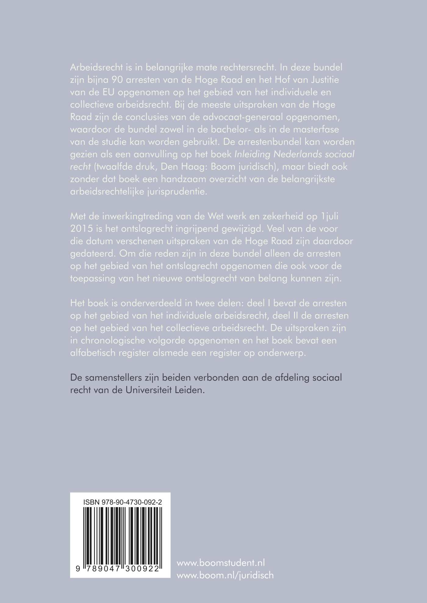 Arbeidsrecht is in belangrijke mate rechtersrecht. In deze bundel zijn bijna 90 arresten van de Hoge Raad en het Hof van Justitie van de EU opgenomen op het gebied van het individuele en collectieve arbeidsrecht. Bij de meeste uitspraken van de Hoge Raad zijn de conclusies van de advocaat-generaal opgenomen, waardoor de bundel zowel in de bachelor- als in de masterfase van de studie kan worden gebruikt. De arrestenbundel kan worden gezien als een aanvulling op het boek Inleiding Nederlands sociaal recht (veertiende druk, Den Haag: Boom juridisch), maar biedt ook zonder dat boek een handzaam overzicht van de belangrijkste arbeidsrechtelijke jurisprudentie.