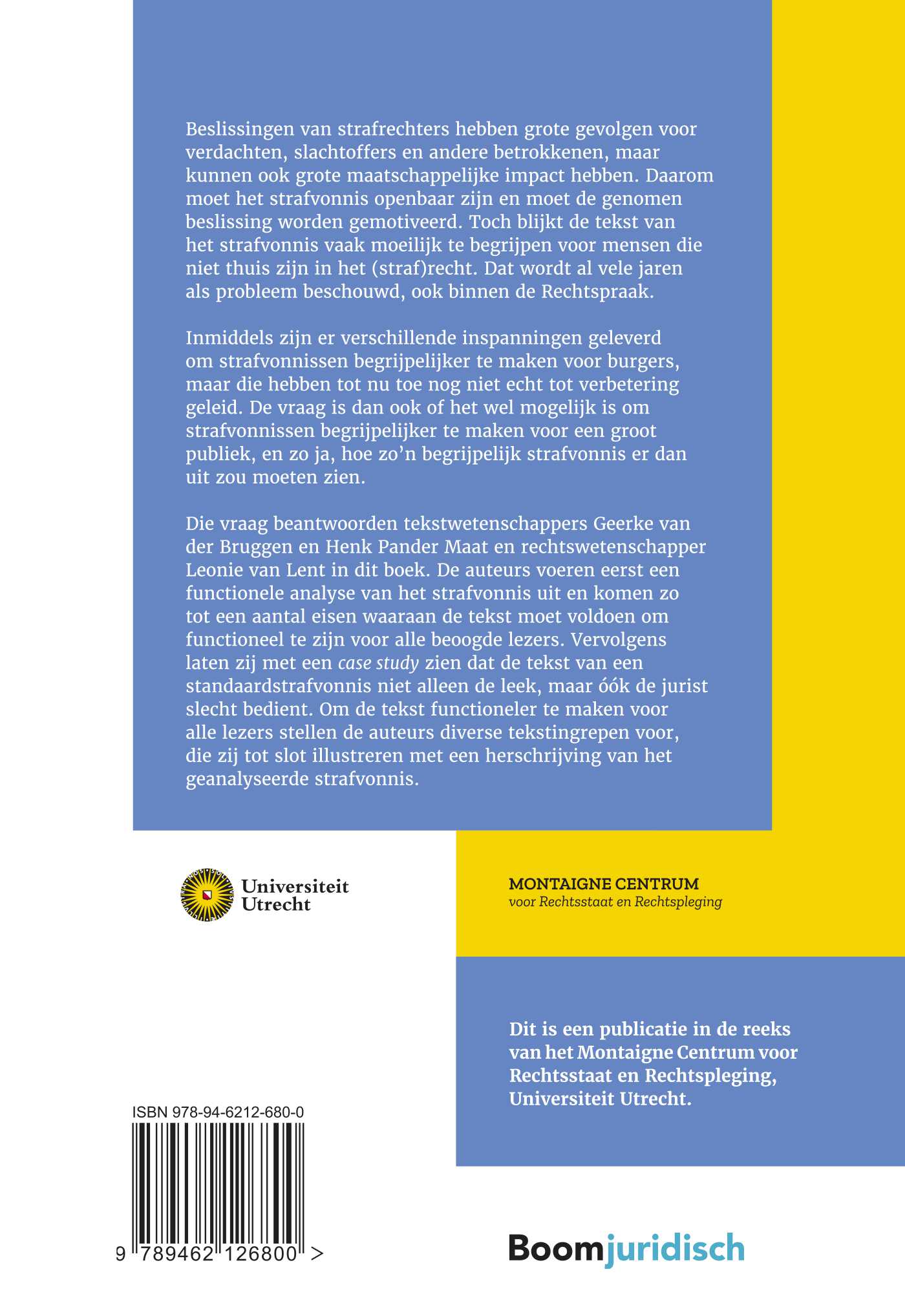 Die vraag beantwoorden tekstwetenschappers Geerke van der Bruggen en Henk Pander Maat en rechtswetenschapper Leonie van Lent in dit boek. De auteurs voeren eerst een functionele analyse van het strafvonnis uit en komen zo tot een aantal eisen waaraan de tekst moet voldoen om functioneel te zijn voor alle beoogde lezers. Vervolgens laten zij met een case study zien dat de tekst van een standaardstrafvonnis niet alleen de leek, maar óók de jurist slecht bedient. Om de tekst functioneler te maken voor alle lezers stellen de auteurs diverse tekstingrepen voor, die zij tot slot illustreren met een herschrijving van het geanalyseerde strafvonnis.
