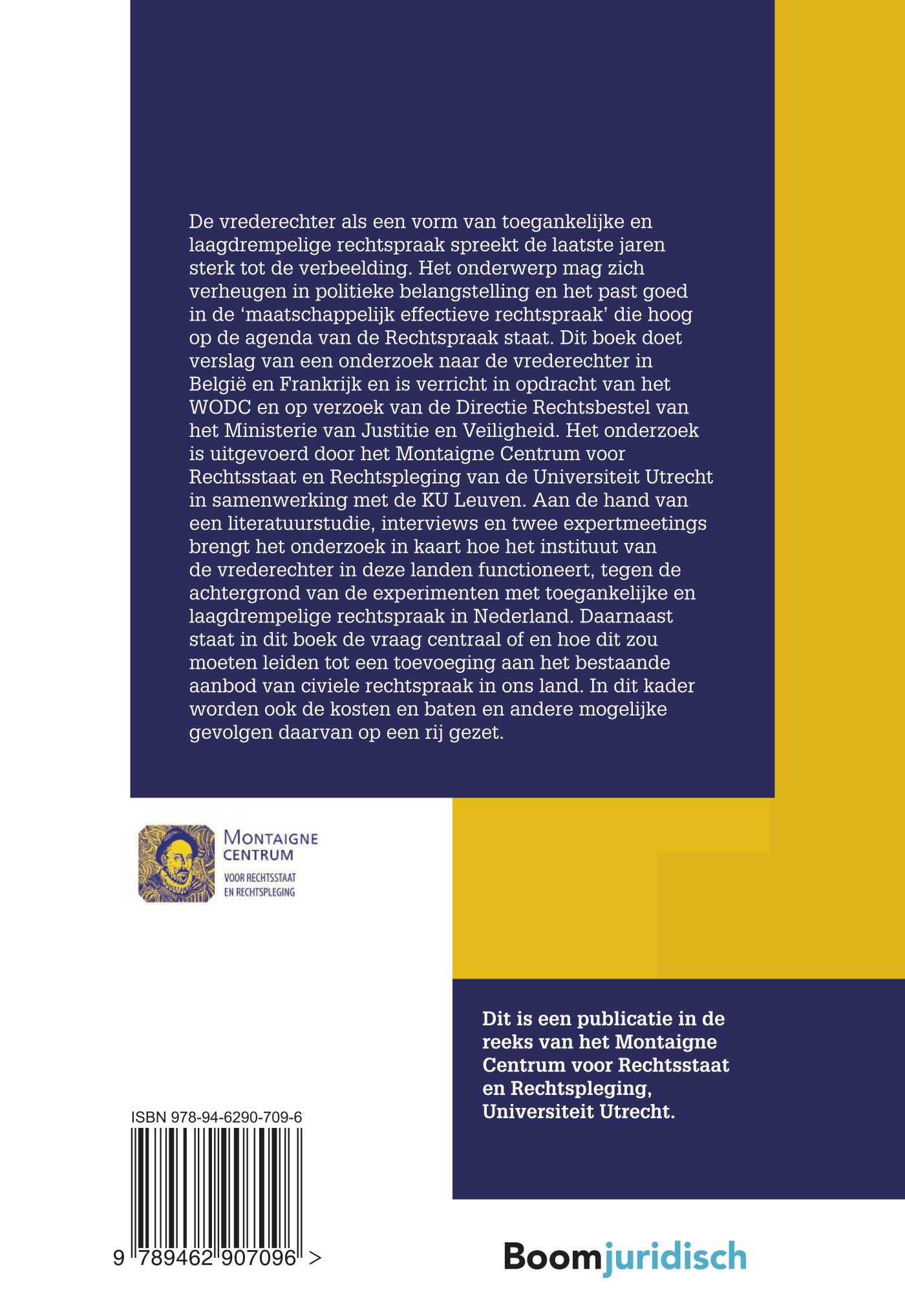 De vrederechter als een vorm van toegankelijke en laagdrempelige rechtspraak spreekt de laatste jaren sterk tot de verbeelding. Het onderwerp mag zich verheugen in politieke belangstelling en het past goed in de ‘maatschappelijk effectieve rechtspraak’ die hoog op de agenda van de Rechtspraak staat. Dit boek doet verslag van een onderzoek naar de vrederechter in België en Frankrijk en is verricht in opdracht van het WODC en op verzoek van de Directie Rechtsbestel van het Ministerie van Justitie en Veiligheid. Het onderzoek is uitgevoerd door het Montaigne Centrum voor Rechtsstaat en Rechtspleging van de Universiteit Utrecht in samenwerking met de KU Leuven. Aan de hand van een literatuurstudie, interviews en twee expertmeetings brengt het onderzoek in kaart hoe het instituut van de vrederechter in deze landen functioneert, tegen de achtergrond van de experimenten met toegankelijke en laagdrempelige rechtspraak in Nederland. Daarnaast staat in dit boek de vraag centraal of en hoe dit zou moeten leiden tot een toevoeging aan het bestaande aanbod van civiele rechtspraak in ons land. In dit kader worden ook de kosten en baten en andere mogelijke gevolgen daarvan op een rij gezet.