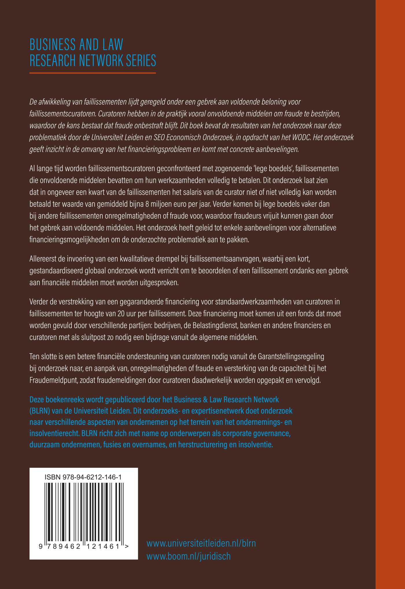 Deze boekenreeks wordt gepubliceerd door het Business & Law Research Network (BLRN) van de Universiteit Leiden. Dit onderzoeks- en expertisenetwerk doet onderzoek naar verschillende aspecten van ondernemen op het terrein van het ondernemings- en insolventierecht. BLRN richt zich met name op onderwerpen als corporate governance, duurzaam ondernemen, fusies en overnames, en herstructurering en insolventie.