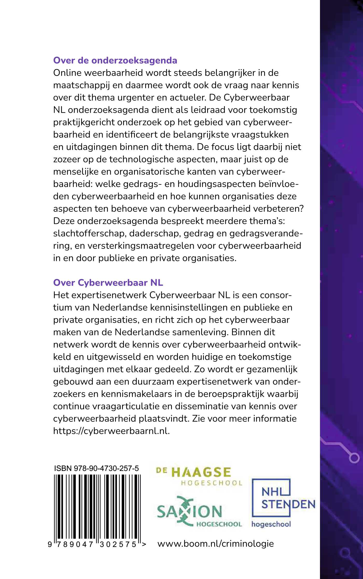 Online weerbaarheid wordt steeds belangrijker in de maatschappij en daarmee wordt ook de vraag naar kennis over dit thema urgenter en actueler. De Cyberweerbaar NL onderzoeksagenda dient als leidraad voor toekomstig praktijkgericht onderzoek op het gebied van cyberweerbaarheid en identificeert de belangrijkste vraagstukken en uitdagingen binnen dit thema. De focus ligt daarbij niet zozeer op de technologische aspecten, maar juist op de menselijke en organisatorische kanten van cyberweerbaarheid: welke gedrags- en houdingsaspecten beïnvloeden cyberweerbaarheid en hoe kunnen organisaties deze aspecten ten behoeve van cyberweerbaarheid verbeteren? Deze onderzoeksagenda bespreekt meerdere thema’s: slachtofferschap, daderschap, gedrag en gedragsverandering, en versterkingsmaatregelen voor cyberweerbaarheid in en door publieke en private organisaties.