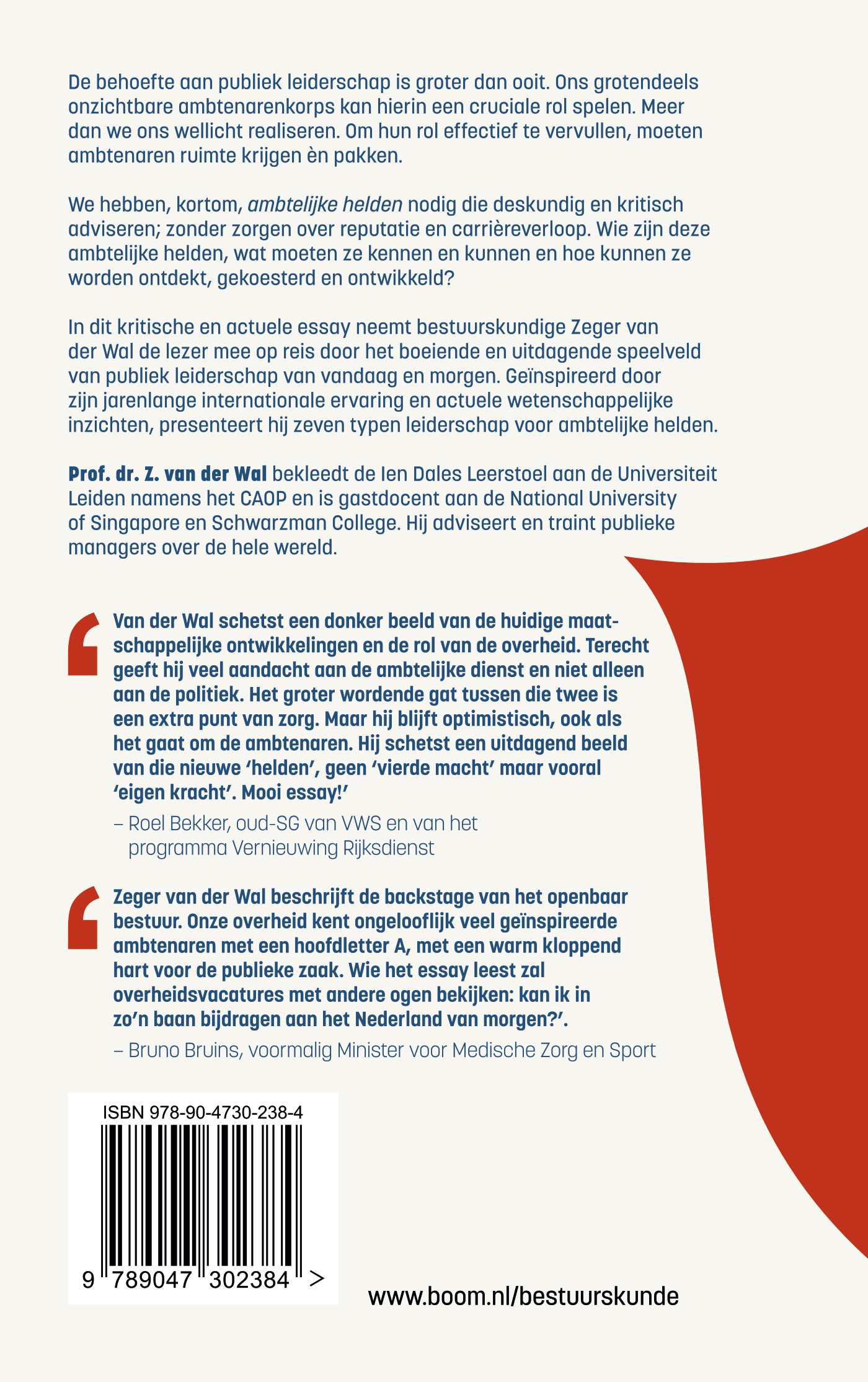 'Zeger van der Wal beschrijft de backstage van het openbaar bestuur. Onze overheid kent ongelooflijk veel geïnspireerde ambtenaren met een hoofdletter A, met een warm kloppend hart voor de publieke zaak. Wie het essay leest zal overheidsvacatures met andere ogen bekijken: kan ik in zo’n baan bijdragen aan het Nederland van morgen?’.