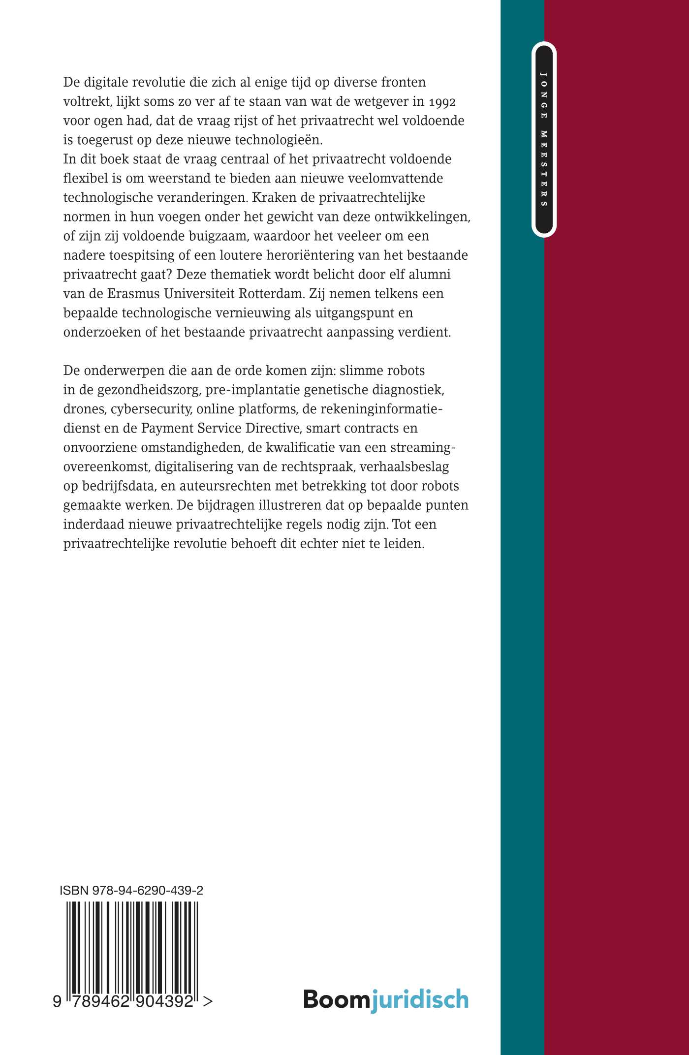 In dit boek staat de vraag centraal of het privaatrecht voldoende flexibel is om weerstand te bieden aan nieuwe veelomvattende technologische veranderingen. Kraken de privaatrechtelijke normen in hun voegen onder het gewicht van deze ontwikkelingen, of zijn zij voldoende buigzaam, waardoor het veeleer om een nadere toespitsing of een loutere heroriëntering van het bestaande privaatrecht gaat? Deze thematiek wordt belicht door elf alumni van de Erasmus Universiteit Rotterdam. Zij nemen telkens een bepaalde technologische vernieuwing als uitgangspunt en onderzoeken of het bestaande privaatrecht aanpassing verdient.