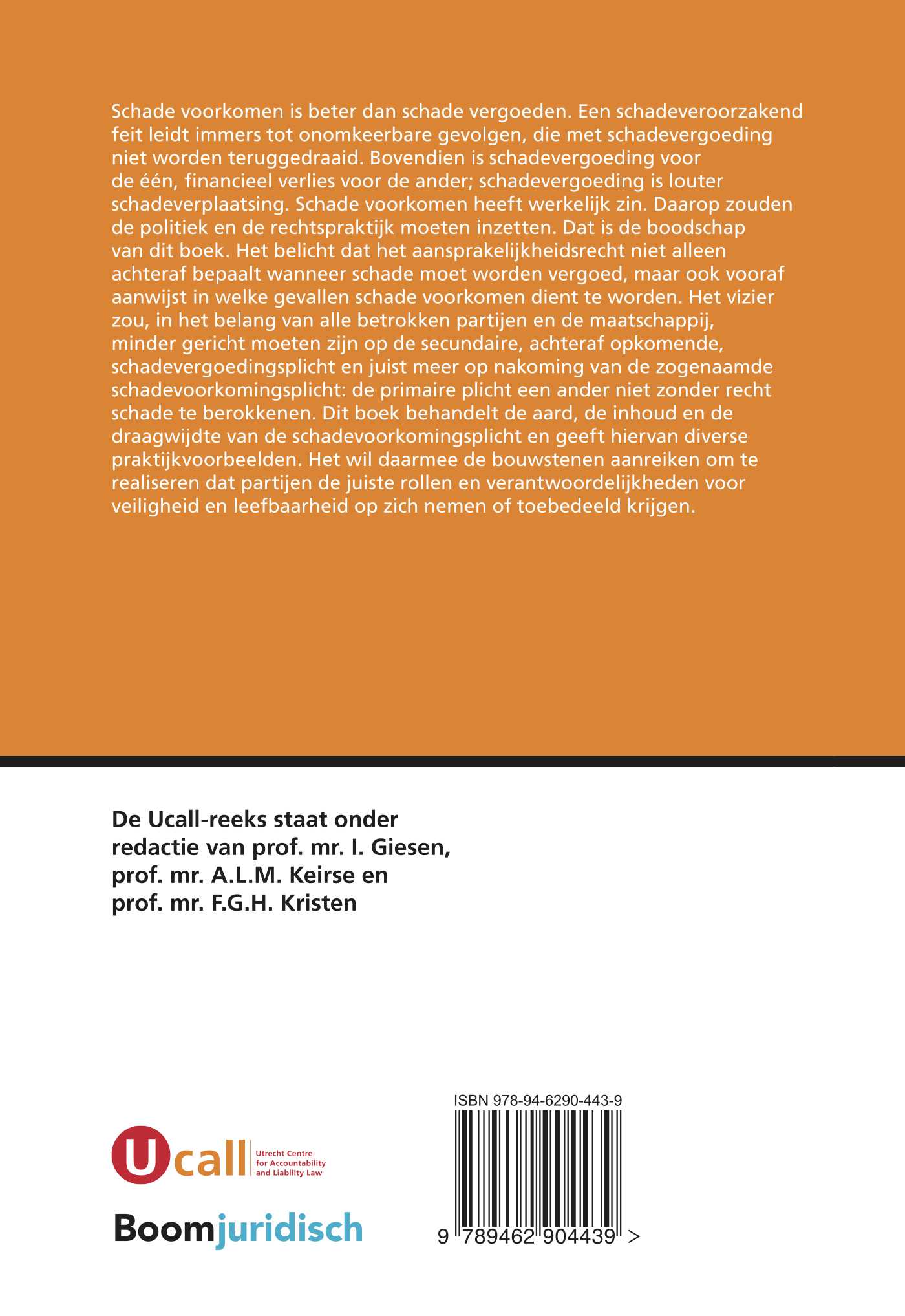 Schade voorkomen is beter dan schade vergoeden. Een schadeveroorzakend feit leidt immers tot onomkeerbare gevolgen, die met schadevergoeding niet worden teruggedraaid. Bovendien is schadevergoeding voor de één, financieel verlies voor de ander; schadevergoeding is louter schadeverplaatsing. Schade voorkomen heeft werkelijk zin. Daarop zouden de politiek en de rechtspraktijk moeten inzetten. Dat is de boodschap van dit boek. Het belicht dat het aansprakelijkheidsrecht niet alleen achteraf bepaalt wanneer schade moet worden vergoed, maar ook vooraf aanwijst in welke gevallen schade voorkomen dient te worden. Het vizier zou, in het belang van alle betrokken partijen en de maatschappij, minder gericht moeten zijn op de secundaire, achteraf opkomende, schadevergoedingsplicht en juist meer op nakoming van de zogenaamde schadevoorkomingsplicht: de primaire plicht een ander niet zonder recht schade te berokkenen. Dit boek behandelt de aard, de inhoud en de draagwijdte van de schadevoorkomingsplicht en geeft hiervan diverse praktijkvoorbeelden. Het wil daarmee de bouwstenen aanreiken om te realiseren dat partijen de juiste rollen en verantwoordelijkheden voor veiligheid en leefbaarheid op zich nemen of toebedeeld krijgen.