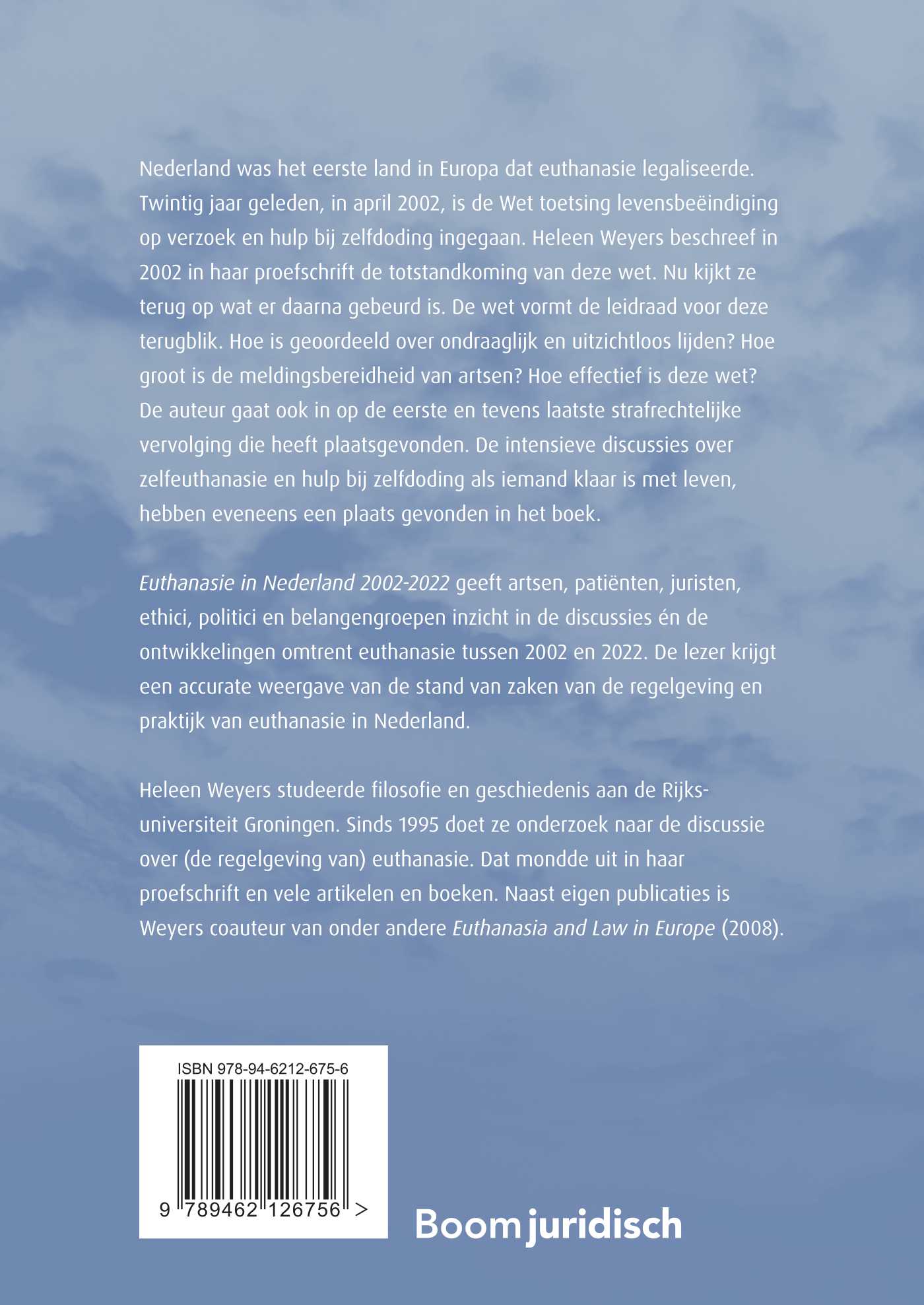 Nederland was het eerste land in Europa dat euthanasie legaliseerde. Twintig jaar geleden, in april 2002, is de Wet toetsing levensbeëindiging op verzoek en hulp bij zelfdoding ingegaan. Heleen Weyers beschreef in 2002 in haar proefschrift de totstandkoming van deze wet. Nu kijkt ze terug op wat er daarna gebeurd is. De wet vormt de leidraad voor deze terugblik. Hoe is geoordeeld over ondraaglijk en uitzichtloos lijden? Hoe groot is de meldingsbereidheid van artsen? Hoe effectief is deze wet? De auteur gaat ook in op de eerste en tevens laatste strafrechtelijke vervolging die heeft plaatsgevonden. De intensieve discussies over zelfeuthanasie en hulp bij zelfdoding als iemand klaar is met leven, hebben eveneens een plaats gevonden in het boek.