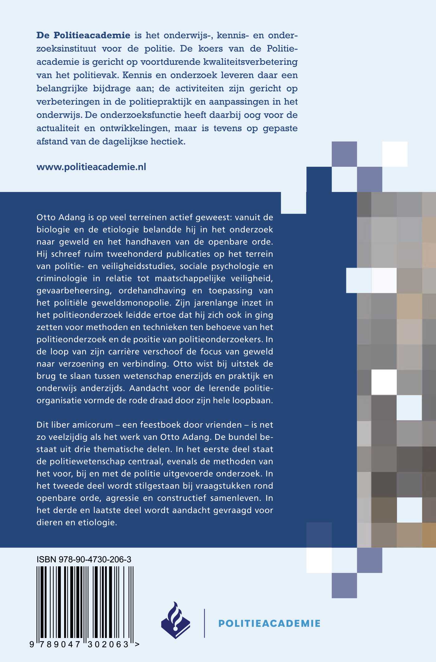Dit liber amicorum – een feestboek door vrienden – is net zo veelzijdig als het werk van Otto Adang. De bundel bestaat uit drie thematische delen. In het eerste deel staat de politiewetenschap centraal, evenals de methoden van het voor, bij en met de politie uitgevoerde onderzoek. In het tweede deel wordt stilgestaan bij vraagstukken rond openbare orde, agressie en constructief samenleven. In het derde en laatste deel wordt aandacht gevraagd voor dieren en etiologie.