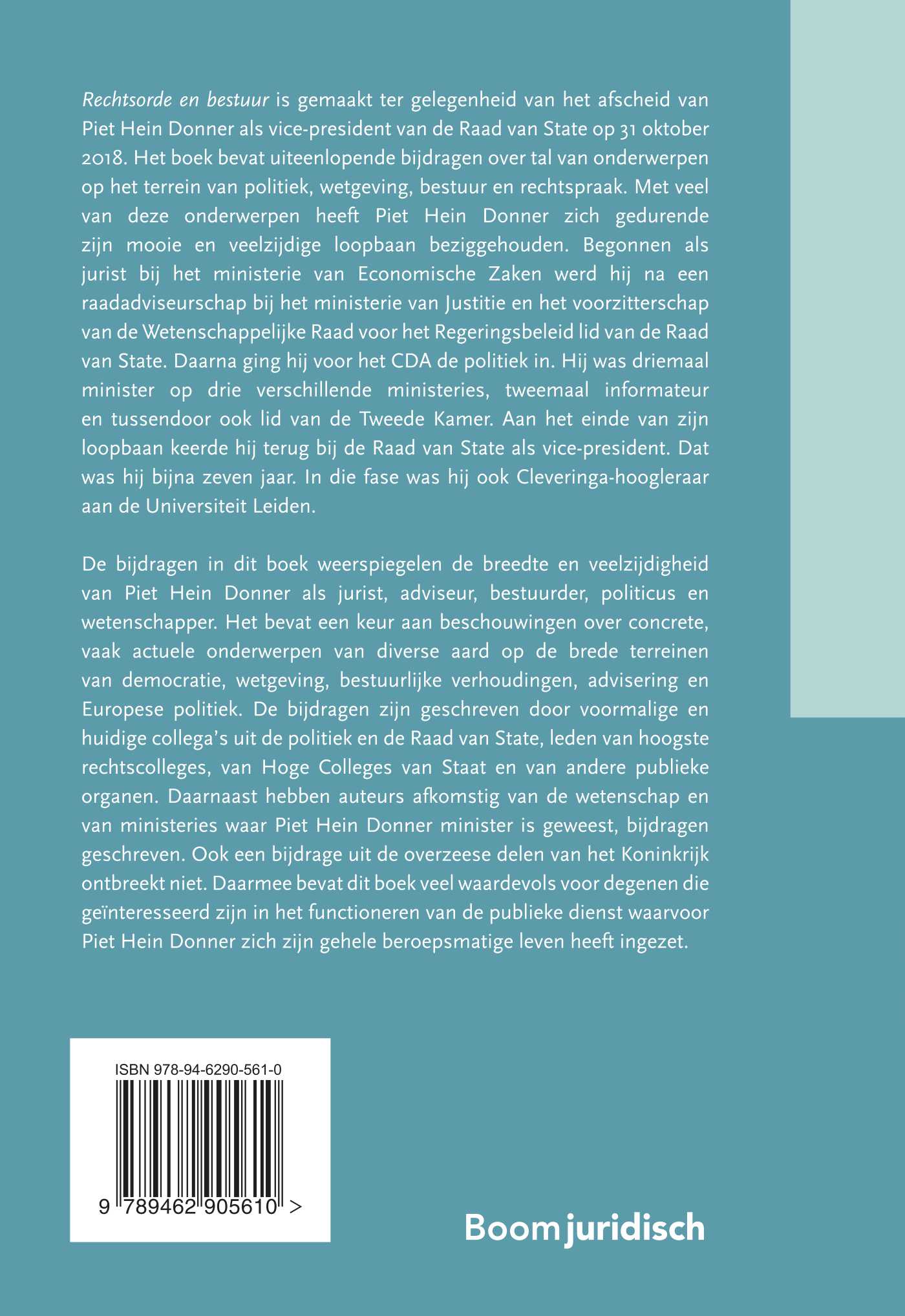 Rechtsorde en bestuur is gemaakt ter gelegenheid van het afscheid van Piet Hein Donner als vice-president van de Raad van State op 31 oktober 2018. Het boek bevat uiteenlopende bijdragen over tal van onderwerpen op het terrein van politiek, wetgeving, bestuur en rechtspraak. Met veel van deze onderwerpen heeft Piet Hein Donner zich gedurende zijn mooie en veelzijdige loopbaan beziggehouden. Begonnen als jurist bij het ministerie van Economische Zaken werd hij na een raadadviseurschap bij het ministerie van Justitie en het voorzitterschap van de Wetenschappelijke Raad voor het Regeringsbeleid lid van de Raad van State. Daarna ging hij voor het CDA de politiek in. Hij was driemaal minister op drie verschillende ministeries, tweemaal informateur en tussendoor ook lid van de Tweede Kamer. Aan het einde van zijn loopbaan keerde hij terug bij de Raad van State als vice-president. Dat was hij bijna zeven jaar. In die fase was hij ook Cleveringa-hoogleraar aan de Universiteit Leiden.