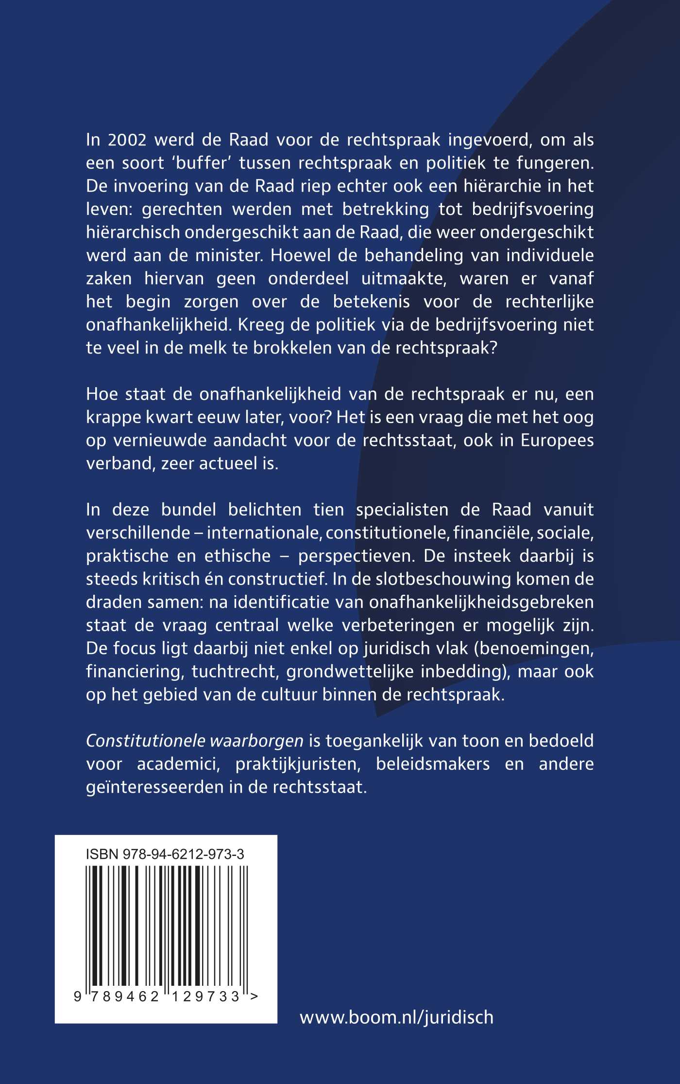 Constitutionele waarborgen is toegankelijk van toon en bedoeld voor academici, praktijkjuristen, beleidsmakers en andere geïnteresseerden in de rechtsstaat.