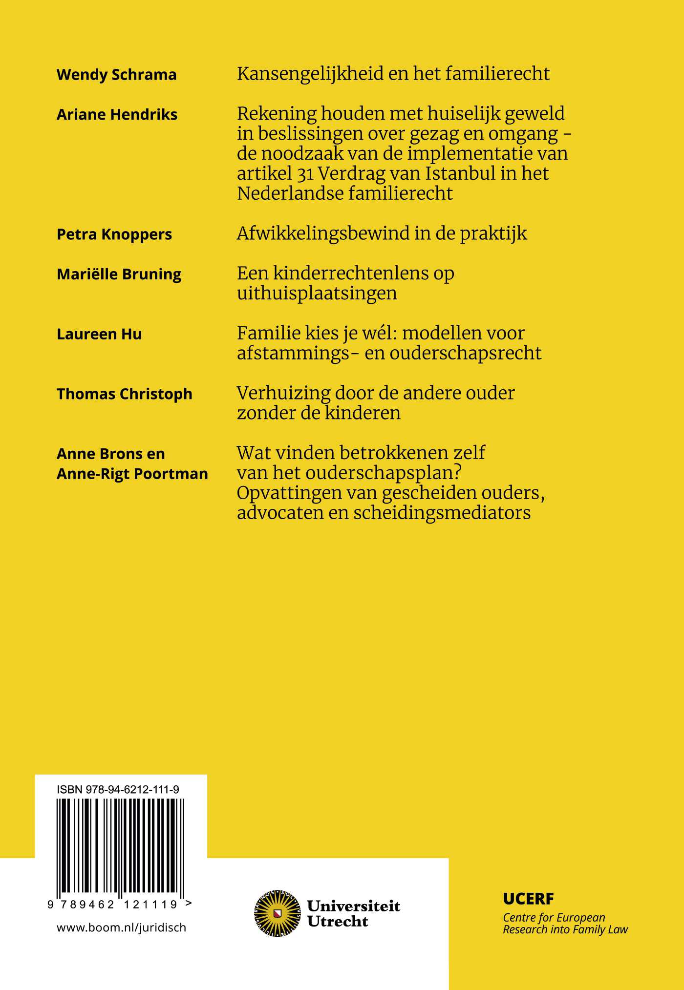 Deze bundel bevat bijdragen naar aanleiding van het negentiende UCERF-symposium en gaat in op actuele vraagstukken binnen het familierecht. Aan bod komen onder meer de betekenis van kansengelijkheid voor het familierecht, de rol van huiselijk geweld bij gezags- en omgangsbesluiten, de positie van eenoudergezinnen, ontwikkelingen in het afstammings- en ouderschapsrecht en ervaringen met het ouderschapsplan in de praktijk.