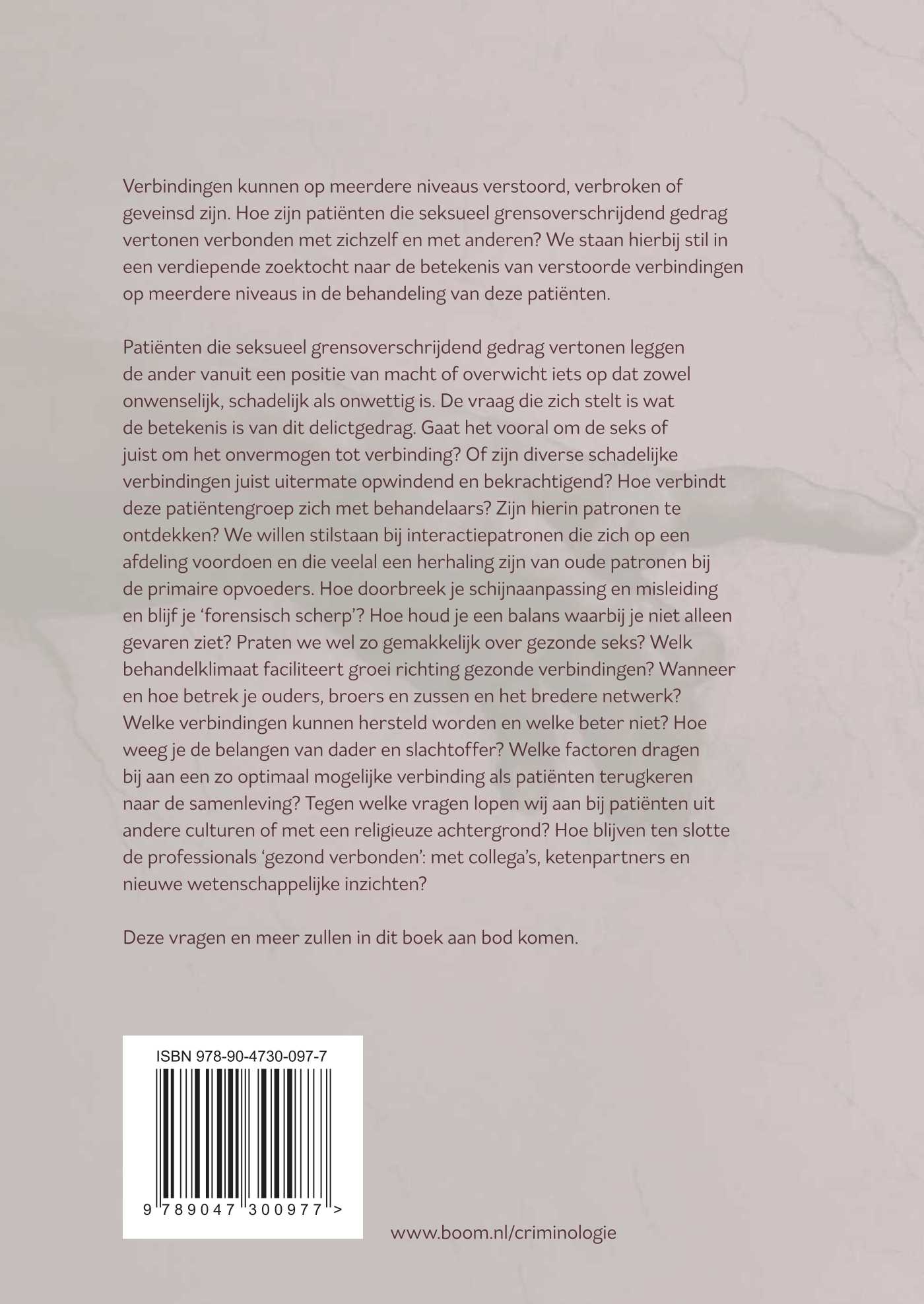 Patiënten die seksueel grensoverschrijdend gedrag vertonen leggen de ander vanuit een positie van macht of overwicht iets op dat zowel onwenselijk, schadelijk als onwettig is. De vraag die zich stelt is wat de betekenis is van dit delictgedrag. Gaat het vooral om de seks of juist om het onvermogen tot verbinding? Of zijn diverse schadelijke verbindingen juist uitermate opwindend en bekrachtigend? Hoe verbindt deze patiëntengroep zich met behandelaars? Zijn hierin patronen te ontdekken? We willen stilstaan bij interactiepatronen die zich op een afdeling voordoen en die veelal een herhaling zijn van oude patronen bij de primaire opvoeders. Hoe doorbreek je schijnaanpassing en misleiding en blijf je ‘forensisch scherp’? Hoe houd je een balans waarbij je niet alleen gevaren ziet? Praten we wel zo gemakkelijk over gezonde seks? Welk behandelklimaat faciliteert groei richting gezonde verbindingen? Wanneer en hoe betrek je ouders, broers en zussen en het bredere netwerk? Welke verbindingen kunnen hersteld worden en welke beter niet? Hoe weeg je de belangen van dader en slachtoffer? Welke factoren dragen bij aan een zo optimaal mogelijke verbinding als patiënten terugkeren naar de samenleving? Tegen welke vragen lopen wij aan bij patiënten uit andere culturen of met een religieuze achtergrond? Hoe blijven ten slotte de professionals ‘gezond verbonden’: met collega’s, ketenpartners en nieuwe wetenschappelijke inzichten?