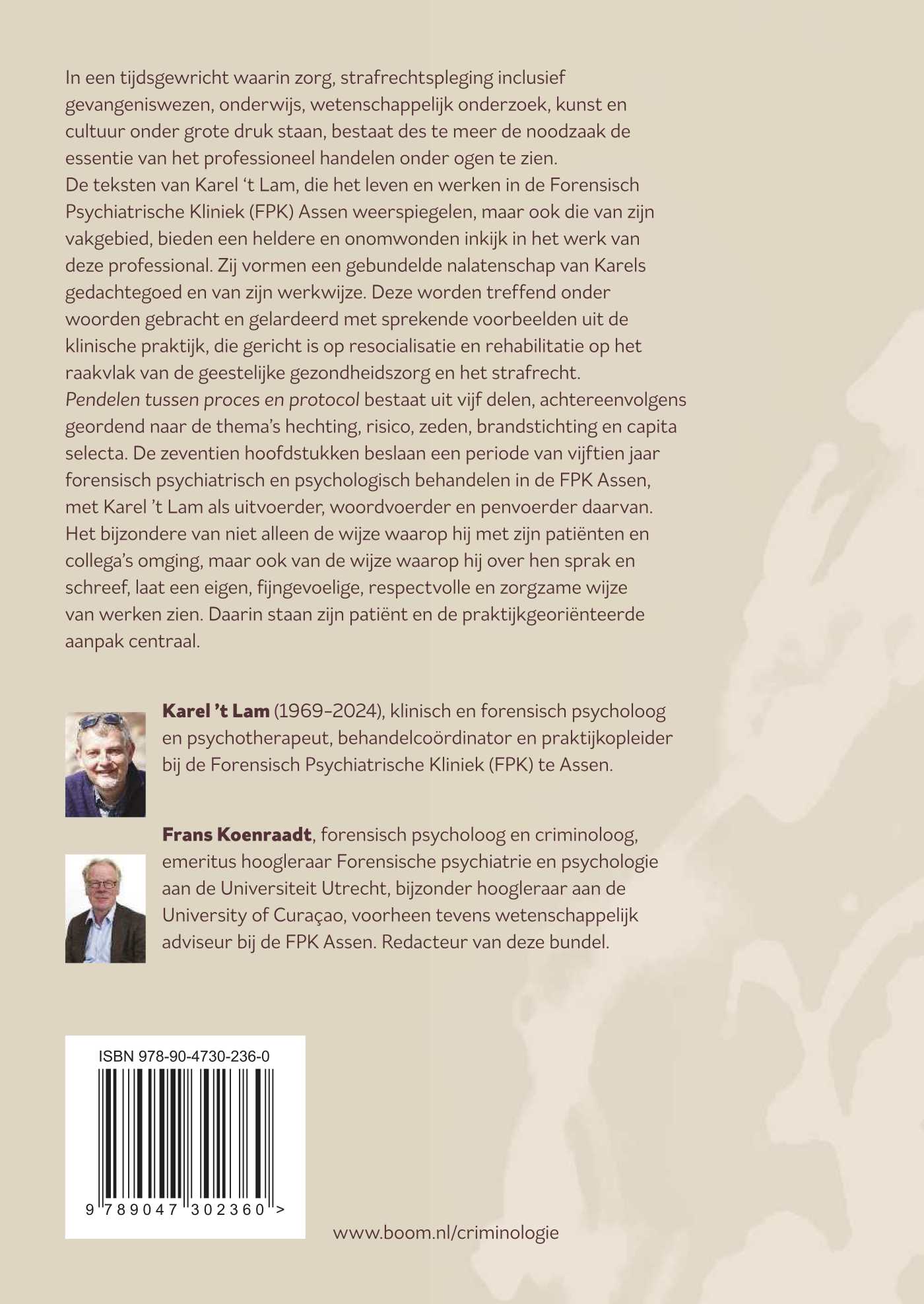 De teksten van Karel ‘t Lam, die het leven en werken in de Forensisch Psychiatrische Kliniek (FPK) Assen weerspiegelen, maar ook die van zijn vakgebied, bieden een heldere en onomwonden inkijk in het werk van deze professional. Zij vormen een gebundelde nalatenschap van Karels gedachtegoed en van zijn werkwijze. Deze worden treffend onder woorden gebracht en gelardeerd met sprekende voorbeelden uit de klinische praktijk, die gericht is op resocialisatie en rehabilitatie op het raakvlak van de geestelijke gezondheidszorg en het strafrecht.