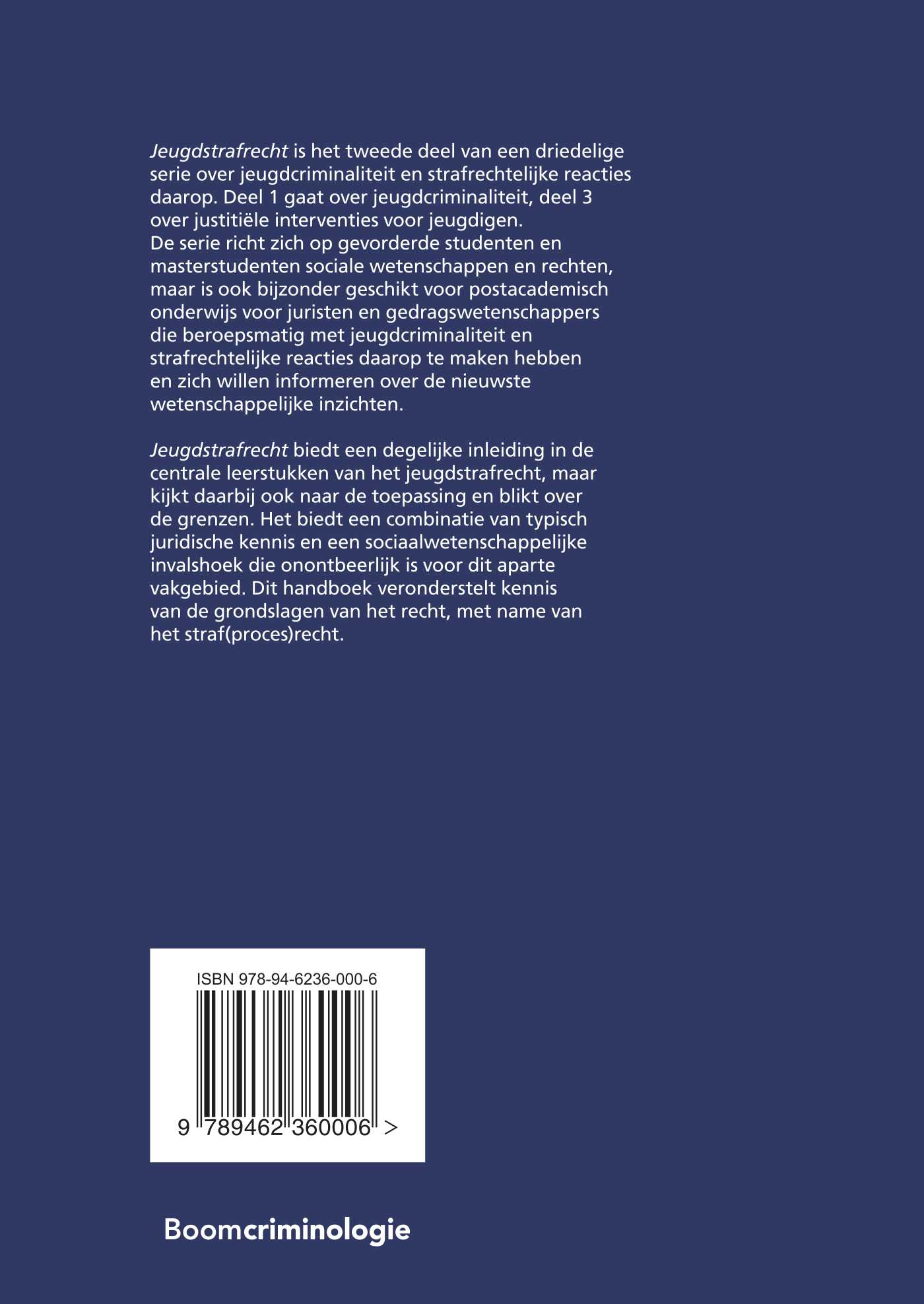 Jeugdstrafrecht is het tweede deel van een driedelige serie over jeugdcriminaliteit en strafrechtelijke reacties daarop. Deel 1 gaat over jeugdcriminaliteit, deel 3 over justitiële interventies voor jeugdigen. De serie richt zich op gevorderde studenten en masterstudenten sociale wetenschappen en rechten, maar is ook bijzonder geschikt voor postacademisch onderwijs voor juristen en gedragswetenschappers die beroepsmatig met jeugdcriminaliteit en strafrechtelijke reacties daarop te maken hebben en zich willen informeren over de nieuwste wetenschappelijke inzichten.