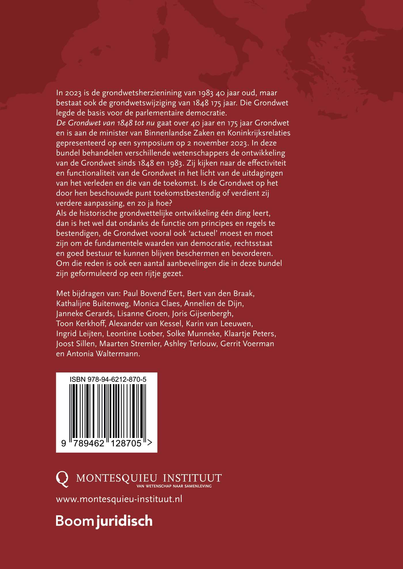 De Grondwet van 1848 tot nu gaat over 40 jaar en 175 jaar Grondwet en is aan de minister van Binnenlandse Zaken en Koninkrijksrelaties gepresenteerd op een symposium op 2 november 2023. In deze bundel behandelen verschillende wetenschappers de ontwikkeling van de Grondwet sinds 1848 en 1983. Zij kijken naar de effectiviteit en functionaliteit van de Grondwet in het licht van de uitdagingen van het verleden en die van de toekomst. Is de Grondwet op het door hen beschouwde punt toekomstbestendig of verdient zij verdere aanpassing, en zo ja hoe?