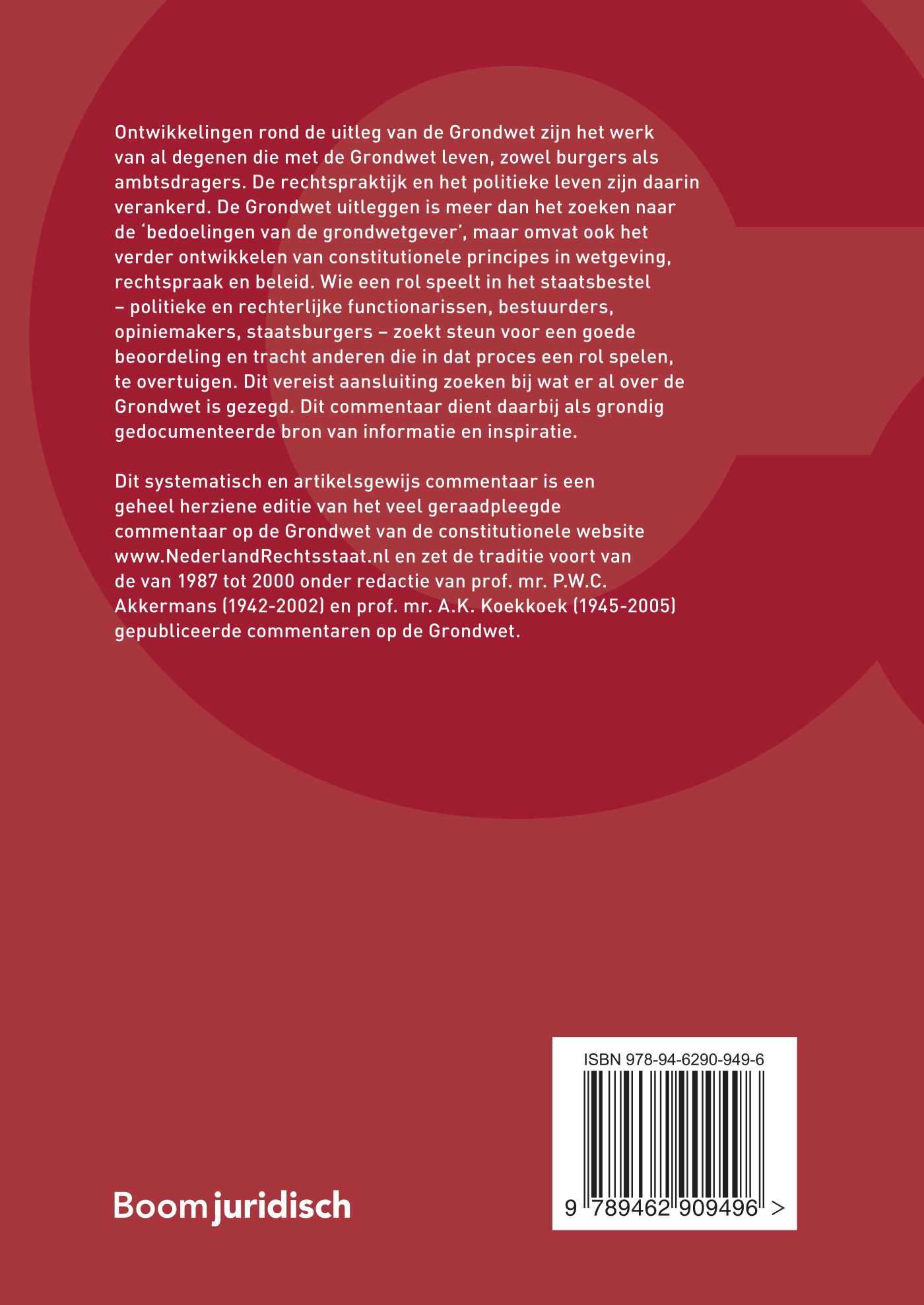 Dit systematisch en artikelsgewijs commentaar is een geheel herziene editie van het veel geraadpleegde commentaar op de Grondwet van de constitutionele website www.NederlandRechtsstaat.nl en zet de traditie voort van de van 1987 tot 2000 onder redactie van prof. mr. P.W.C. Akkermans (1942-2002) en prof. mr. A.K. Koekkoek (1945-2005) gepubliceerde commentaren op de Grondwet.
