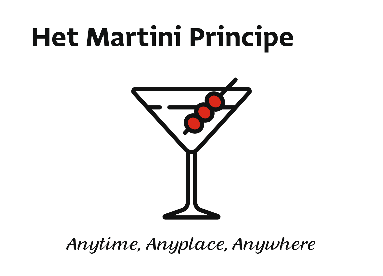 Martini had in een (ver) verleden een reclame met de slogan ‘Anytime, Anyplace, Anywhere’. Ik noem dit het Martini Principe, een handig model voor innovatie. Elk product, elke dienst, elk proces dat niet voldoet aan het Martini Principe kan (en zal) verbeterd worden. Kan ik het product of dienst op elk moment, op elke locatie en op elke manier afnemen? Kijk met het Martini Principe in gedachten naar je dienstverlening. En verbeter het. Anders verbeteren anderen het wel.