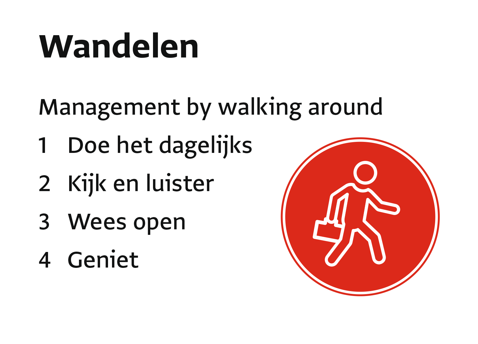 Management by walking around. Management dat minstens twee dagen in de week op de werkvloer loopt. Kom daar nog maar eens om. Toen ik dat in een managementteam voorstelde, was het antwoord van een van de managers: ‘Maar wanneer moet ik dan mijn echte werk doen?’ Die had het nog niet goed begrepen. Dit is je echte werk: er zijn voor je team, er zijn voor je mensen. Ze waarderen het dat je er voor ze bent en niet de hele dag in vergaderingen zit. En je steekt er nog wat van op ook!