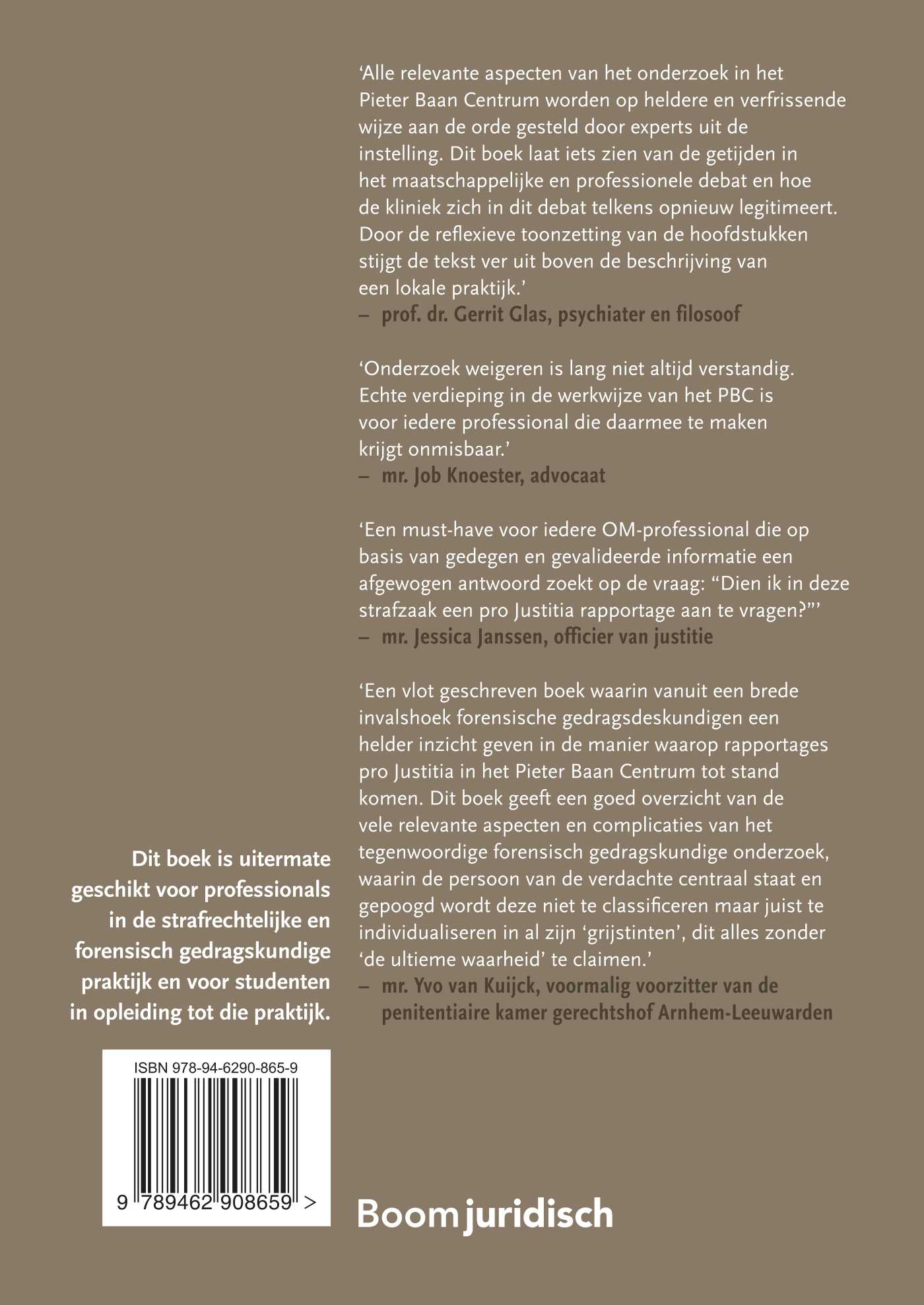 “Een vlot geschreven boek waarin vanuit een brede invalshoek forensische gedragsdeskundigen een helder inzicht geven in de manier waarop rapportages pro Justitia in het Pieter Baan Centrum tot stand komen. Dit boek geeft een goed overzicht van de vele relevante aspecten en complicaties van het tegenwoordige forensisch gedragskundige onderzoek, waarin de persoon van de verdachte centraal staat en gepoogd wordt deze niet te classificeren maar juist te individualiseren in al zijn ‘grijstinten’, dit alles zonder ‘de ultieme waarheid’ te claimen.”