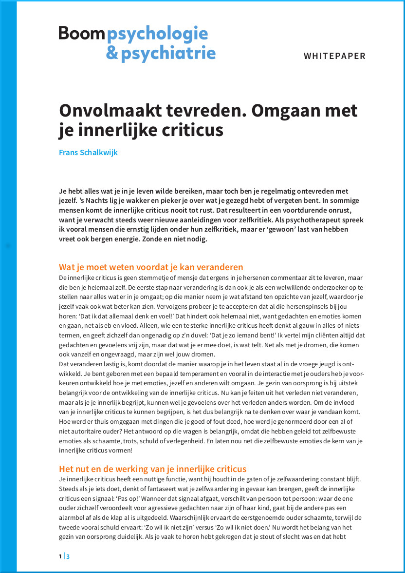 Als je onder je innerlijke stem lijdt, kun je daar wat aan doen. Die innerlijke criticus is namelijk geen 'stemmetje' of 'mannetje in je brein: die ben je helemaal zelf. Frans Schalkwijk helpt je in dit boek om je innerlijke criticus milder te maken. In Onvolmaakt tevreden lees je relativerende adviezen die je helpen bewuster met je innerlijke criticus om te gaan.