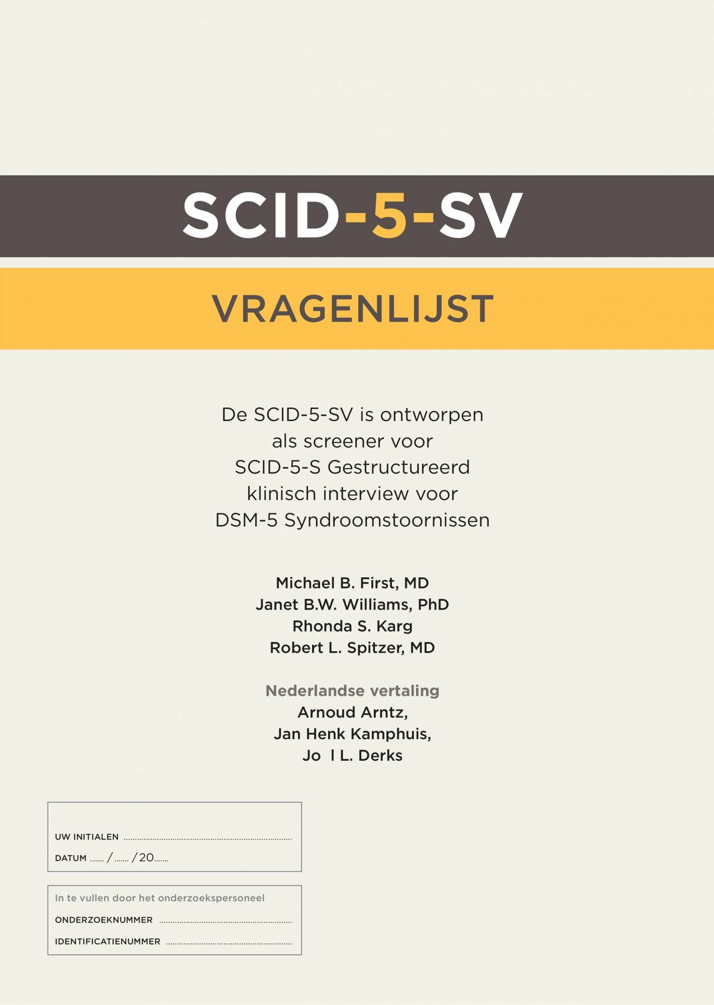 De SCID-5-S Vragenlijst (SCID-5-SV) is een zelfrapportage-vragenlijst die als screeningsinstrument kan worden gebruikt om bij het afnemen van de SCID-5-S tijd te besparen. De SCID-5-SV is in nauwe samenwerking met Michael First, hoofdauteur van de SCID-5-CV, tot stand gekomen. Geïnterviewden hebben meestal 10-20 minuten nodig om de SCID-5-SV in te vullen. Wanneer de SCID-5-SV is ingevuld kunt u deze gebruiken om te bepalen welke onderdelen van de SCID-5-S u tijdens het interview over kunt slaan.